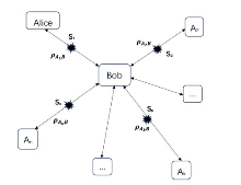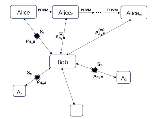 星型网络场景中多边测量下的非局域性共享. Alice$ _1 $, A$ _2 $, $ \cdots $, A$ _p $ 一侧进行顺序测量, 此时网络态由 $ \rho _{A_1B}\otimes \rho _{A_2B}\otimes \cdots\otimes \rho _{A_nB} $ 变为 $ \rho _{A_1B}^{\left( m \right)}\otimes \rho _{A_2B}^{\left( m \right)}\otimes \cdots\otimes \rho _{A_pB}^{\left( m \right)}\otimes \cdots\otimes \rho _{A_nB} $."