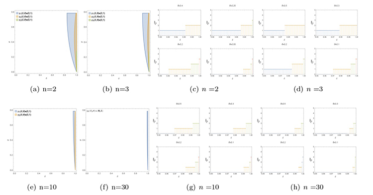 (a) $ n=2 $ 时蓝色, 橙色, 绿色分别代表满足 $ \gamma _1\left( \delta,\theta \right) \in \left( 0,1 \right) $, $ \gamma _2\left( \delta,\theta \right) \in \left( 0,1 \right) $, $ \gamma _3\left( \delta,\theta \right) \in \left( 0,1 \right) $ 的参数 $ \alpha $ 和 $ \theta $ 的范围. (b) $ n=3 $. (c) $ n=10 $. (d) $ n=30 $. (e) $ n=2 $ 时与单个 Bob 共享噪声初始态的非局域性的最大 Alice 的数量 $ n_{A}^{\max} $ 与参数 $ \delta $ 的关系. (f) $ n=3 $. (g) $ n=10 $. (h) $ n=30 $."