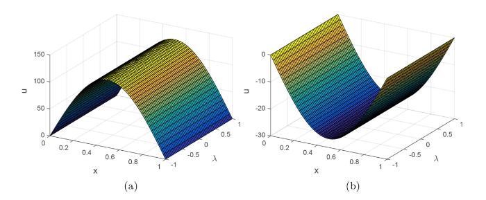 当 $a=1,b=1,d=1,L=1$ 时分歧解, 图 (a): $\lambda<\frac{\pi^2}{L^2}+a\frac{\pi^4}{L^4}$ , 图 (b): $\lambda>\frac{\pi^2}{L^2}+a\frac{\pi^4}{L^4}$
