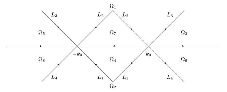 (2.26) $\begin{aligned}S_{11}(k)&=1-{\rm i}ck-\frac{c^{2}}{2}k^{2}+O(k^{3}), \quad k\to0,\\S_{22}(k)&=1+{\rm i}ck-\frac{c^{2}}{2}k^{2}+O(k^{3}), \quad k\to0,\end{aligned}$