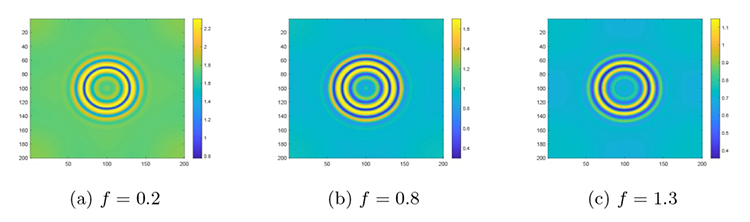 $\textbf{注 5.2}\quad$ 对从图4 到图5 斑图模式转变的解释: 当恐惧效应系数 $f$ 较大时, 捕食者对猎物的威胁显著.猎物为了降低被捕食的概率,往往会在大尺度上进行大范围的移动以逃离危险区域, 这种行为导致猎物在较大范围内形成更均匀的密度分布. 所以增大恐惧效应系数能将斑图模式演化成条状斑图. 随着恐惧效应系数 $f$ 的减小, 捕食者的威胁感降低,这种压力的减轻使得部分猎物生活在低风险区域, 这会导致猎物的局部聚集, 从而形成更多更为分散的点状斑图.