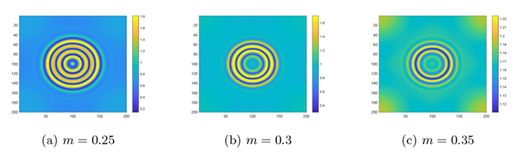 系统 (2.1) 在捕食者种内竞争系数 $m$ 不同取值下的色散曲线及斑图模式.