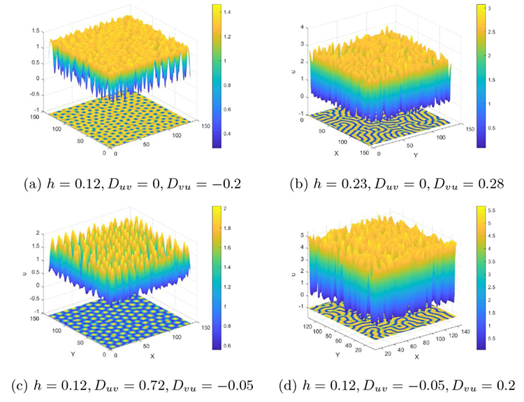 (3) 对扩散系统进行数值仿真, 阐明了不同相互作用强度和交叉扩散系数的改变对斑图模式的影响, 并且给出了不同斑图模式生物学意义上的解释; 且不同的相互作用机制还会在不同程度上改变系统稳定性和图灵斑图模式的稳定速度.