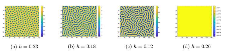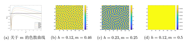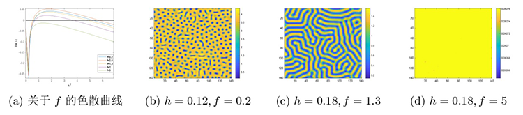 首先, 设定其余参数为 $f=0.8,b=1.2,m=0.3$ . 通过变化 $h$ 值, 通过对系统 (2.1) 的数值模拟得到了如图3 所示的色散曲线及图4(a)-(d) 所示的不同斑图模式. 当 $h=0.23$ 时 (图4(a) ), 猎物种群形成稳定且规则的点状斑图. 当 $h$ 调小至 $h=0.18$ 时 (图4(b) ), 点与条状斑图的分布整体趋于平衡, 当 $h=0.12$ 时 (图4(c) ), 斑图模式转变为以条状斑图占主导的迷宫斑图, 而当 $h=0.26$ 时 (图4(d) ), 斑图模式转变为纯色斑图, 即系统稳定性发生了变化.