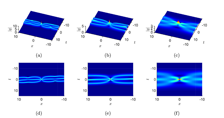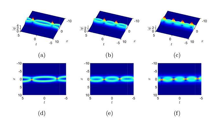 二孤子共振, 参数 $\beta=0.01$ , $\lambda_1=1.6+0.6i$ , (a,d) $\lambda_3=1+0.5i$ ; (b,e) $\lambda_3=1+0.3i$ ; (c,f) $\lambda_3=1+0.1i$ .