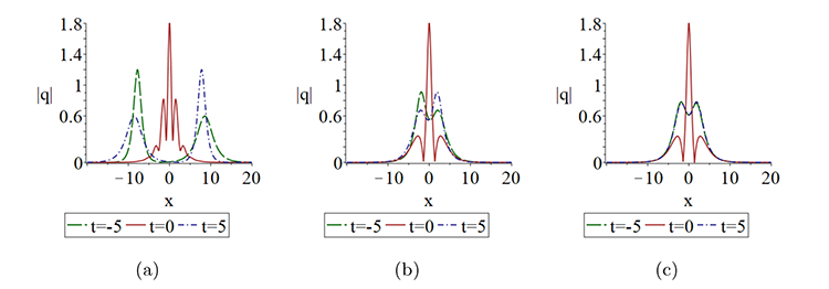 当 $\lambda_{3R}=0.8$ , 在图6(a) 中, 可以观察到, 在 $t=-5$ 时刻, 孤子呈现两个分离的局部峰值, 随着时间演化, 孤子在 $t=0$ 附近发生明显的相互作用, 形成了瞬态的共振结构, 并在 $t=5$ 时刻趋于新的稳定分布. 当 $\lambda_{3R}=0.05$ , 图6(b) 进一步刻画了孤子共振后的动力学行为. 初始时刻 ($t=-5$ ) , 孤子依然保持较大分离度, 但在 $t=0$ 附近形成了更集中的峰值结构, 说明孤子间的相互作用增强, 并伴随明显的局部增益效应. 最终, 在 $t=5$ 时刻, 孤子趋向于新的稳定态, 与原始状态相比, 形成了更紧密的双峰结构. 图6(c) 反映了孤子共振向孤子分子态演化的趋势. 当 $\lambda_{3R}=0$ , 与前两幅图类似, 在 $t=-5$ 处, 孤子仍保持分离, 但在 $t=0$ 附近发生剧烈的共振, 使得局部振幅大幅增加. 最终, 在 $t=5$ 时刻, 孤子演化成了更明显的双峰分子态, 这表明孤子间的长时间相互作用促成了稳定的孤子分子结构的形成.