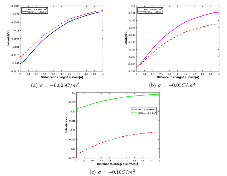 PNP 和 VDPNP 方程模拟的纳米孔带电表面附近的电势分布结果.