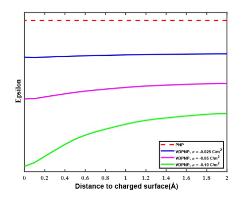 PNP和VDPNP 方程模拟的纳米孔带电表面附近的介电系数的分布结果.