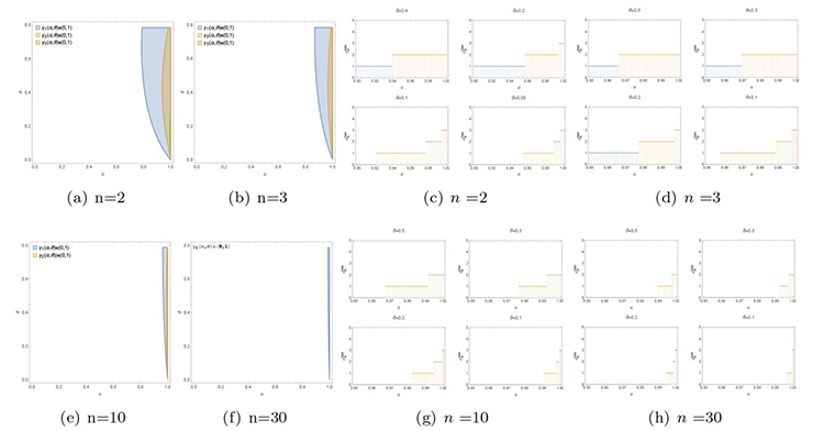 图4 (a) $ n=2 $ 时蓝色, 橙色, 绿色分别代表满足 $ \gamma _1\left( \alpha,\theta \right) \in \left( 0,1 \right) $, $ \gamma _2\left( \alpha,\theta \right) \in \left( 0,1 \right) $, $ \gamma _3\left( \alpha,\theta \right) \in \left( 0,1 \right) $ 的参数 $ \alpha $ 和$ \theta $ 的范围. (b) $ n=3 $. (c) $ n=10 $. (d) $ n=30 $. (e) $ n=2 $ 时与单个 Bob 共享噪声初始态的非局域性的最大 Alice 的数量 $ n_{A}^{\max} $ 与参数 $ \alpha $ 的关系. (f) $ n=3 $. (g) $ n=10 $. (h) $ n=30 $.