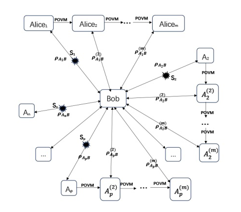 图6 星型网络场景中多边测量下的非局域性共享. Alice$ _1 $, A$ _2 $, $ \cdots $, A$ _p $ 一侧进行顺序测量, 此时网络态由 $ \rho _{A_1B}\otimes \rho _{A_2B}\otimes \cdots\otimes \rho _{A_nB} $ 变为 $ \rho _{A_1B}^{\left( m \right)}\otimes \rho _{A_2B}^{\left( m \right)}\otimes \cdots\otimes \rho _{A_pB}^{\left( m \right)}\otimes \cdots\otimes \rho _{A_nB} $.