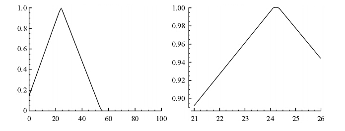 表 2给出该欧式看涨期权的部分置信水平,图 1给出期权价格的隶属函数. 由图 1我们可以看出该隶属函数为L-R模糊函数,函数在左半边区间是单增的, 在右半区间是单减的,单增部分反映了卖者的满意度随着价格的上升而增大, 单减部分反映了买者的满意度随着价格的上升而减小.当欧式看涨期权的价格 为24.8时,它的置信水平为0.984.因此如果投资者对98.4\%的满意度满意的话, 他可以用24.8作为他购买期权的参考价格.当欧式期权的价格为24.2时, 他的满意度为1.