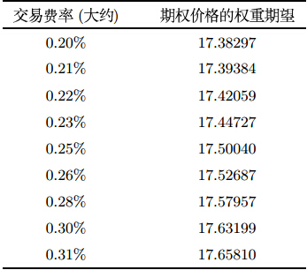 从表 4中可以看出来在其它参数不变的情况下,期权价格模 糊期望随着交易费用率的增大而增大, 这从直观上理解也是合理的,当交易费用率变大的时候,期权金 应该更加昂贵一些.