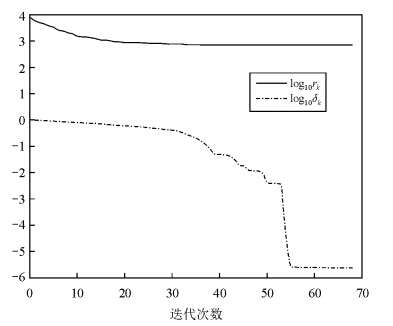 例 5.1 求解矩阵方程组 $$\label{eqn 5.1} \left\{ \begin{array}{ll} A_{11}X_1B_{11}+A_{12}X_2B_{12}=C_1,\\ A_{21}X_1B_{21}+A_{22}X_2B_{22}=C_2, \end{array} \right. (5.1) $$ 其中 $$A_{11} = \left(\begin{array}{rrrrrrrr} 1 & 3 & -2 & 5 & -1 & 4 & 2 & 2\\ 3 & -7 & 1 & -8 & 2 & -9 & 4 & -8\\ 3 & -2 & 4 & -4 & 5 & -3 & 5 & -4\\ 11 & 6 & 12 & 7 & 10 & 4 & 12 & 7\\ -5 & 1 & -5 & 2 & -3 & 3 & -6 & 2\\ 9 & 4 & 6 & 3 & 7 & 5 & 8 & 3\\ 8 & -3 & 9 & -3 & 5 & -6 & 7 & -2 \end{array}\right), B_{11} = \left(\begin{array}{rrrrrrr} -1 & 4 & -1 & 4 & -1 & 4 & -1\\ 5 & -1 & 5 & -1 & 5 & -1 & 5\\ -1 & -2 & -1 & -2 & -1 & -2 & -1\\ 3 & 9 & 3 & 9 & 3 & 9 & 3\\ 7 & -8 & 7 & -8 & 7 & -8 & 7\\ -3 & 5 & -3 & 5 & -3 & 5 & -3\\ 4 & -6 & 4 & -6 & 4 & -6 & 4\\ 7 & 2 & 7 & 2 & 7 & 2 & 7 \end{array}\right), $$ $$ A_{12} = \left(\begin{array}{rrrrrrrrr} 3 & -4 & 1 & -3 & 7 & -8 & 2 & -1 & 4\\ -1 & 3 & -2 & 4 & -2 & 6 & -1 & 2 & -2\\ 3 & -5 & 4 & -6 & 6 & -4 & 4 & -3 & 1\\ 3 & -4 & 1 & -7 & 5 & -2 & 3 & -5 & 6\\ -1 & 3 & -3 & 6 & -2 & 1 & -5 & -6 & -4\\ 3 & -5 & 2 & -8 & 1 & -2 & 3 & -7 & 1\\ 1 & 2 & 5 & 2 & 3 & 5 & 1 & 1 & 4 \end{array}\right), B_{12} = \left(\begin{array}{rrrrrrr} -9 & 4 & -9 & 4 & -9 & 4 & -9\\ -2 & 3 & -2 & 3 & -2 & 3 & -2\\ 3 & 5 & 3 & 5 & 3 & 5 & 3\\ 2 & -6 & 2 & -6 & 2 & -6 & 2\\ 9 & 3 & 9 & 3 & 9 & 3 & 9\\ 4 & -13 & 4 & -13 & 4 & -13 & 4\\ 11 & -5 & 11 & -5 & 11 & -5 & 11\\ -3 & 7 & -3 & 7 & -3 & 7 & -3\\ 6 & 1 & 6 & 1 & 6 & 1 & 6 \end{array}\right),$$ $$ A_{21} =\left(\begin{array}{rrrrrrrrrr} 3 & -1 & 0 & -8 & 2 & -9 & 4 & -7\\ 3 & -2 & 4 & -4 & 5 & -3 & 5 & -4\\ 11 & 6 & 12 & 7 & 10 & 4 & 12 & 7\\ -5 & 1 & -5 & 2 & -3 & 4 & -6 & 2\\ 7 & 4 & 6 & 3 & 7 & 5 & 8 & 3\\ 1 & -3 & 9 & -3 & 5 & -6 & 7 & -4 \end{array}\right), B_{21} =\left(\begin{array}{rrrrrrr} 3 & -1 & 4 & -1 & 4 & -2\\ -1 & 5 & -1 & 5 & -1 & 5\\ -3 & -1 & -2 & -1 & -2 & -1\\ 8 & 3 & 6 & 3 & 8 & 2\\ -8 & 7 & -4 & 7 & -4 & 7\\ 4 & -3 & 5 & -3 & 5 & -2\\ -6 & 4 & -6 & 4 & -6 & 4\\ 1 & 3 & 2 & 6 & 2 & 6 \end{array}\right),$$ $$ A_{22} =\left(\begin{array}{rrrrrrrrrr} 3 & -1 & 3 & -1 & 3 & -1 & 5 & -2 & 2\\ -2 & 3 & -2 & 3 & -2 & 3 & -4 & 1 & -1\\ -3 & 5 & -3 & 5 & -3 & 5 & -1 & 2 & -3\\ -1 & 3 & -1 & 3 & -1 & 3 & -2 & 2 & -1\\ 3 & -1 & 3 & -1 & 3 & -1 & 1 & -1 & 2\\ -3 & 5 & -3 & 5 & -3 & 5 & -4 & 3 & -3 \end{array}\right), B_{22} =\left(\begin{array}{rrrrrrr} 5 & -3 & 5 & -3 & 6 & -1\\ -6 & 2 & -6 & 2 & -6 & 2\\ -8 & 4 & -8 & 4 & -8 & 4\\ -1 & -8 & -1 & -8 & -1 & -8\\ -3 & 2 & -3 & 2 & -3 & 2\\ -1 & -2 & -1 & -2 & -1 & -2\\ 4 & -7 & 4 & -7 & 4 & -7\\ 3 & 12 & 3 & 12 & 3 & 12\\ 2 & -5 & 2 & -5 & 2 & -5 \end{array}\right),$$ $$ C_1 =\left(\begin{array}{rrrrrrr} 262 & -1446 & 262 & -1446 & 262 & -1446 & 262\\ 152 & 1246 & 152 & 1246 & 152 & 1246 & 152\\ 1224 & -450 & 1224 & -450 & 1224 & -450 & 1224\\ 2110 & -2092 & 2110 & -2092 & 2110 & -2092 & 2110\\ -770 & 800 & -770 & 800 & -770 & 800 & -770\\ 1876 & -1106 & 1876 & -1106 & 1876 & -1106 & 1876\\ 1696 & -520 & 1696 & -520 & 1696 & -520 & 1696\\ \end{array}\right), $$ $$ C_2 =\left(\begin{array}{rrrrrrr} -110 & -410 & -502 & -590 & -642 & -628\\ 68 & 282 & -210 & 348 & -144 & 398\\ -1952 & 852 & -1704 & 954 & -1690 & 1132\\ -64 & -406 & 156 & -418 & 178 & -430\\ -422 & 308 & -246 & 380 & -218 & 450\\ -154 & 418 & -476 & 514 & -418 & 550 \end{array}\right). $$ toeplitz$(1:n)$表示第1行为$(1,2,\cdots,n)$的$n$阶Toeplitz矩阵. hilb$(n)$表示$n$阶Hilbert矩阵. 设中心主子矩阵为 $X_{q_1}={\rm toeplitz}(1:4)$,$X_{q_2}={\rm hilb}(5)$. 首先计算$F_i=C_i-A_{i1}\overline{X}_1B_{i1}-A_{i2} \overline{X}_2B_{i2}\;(i=1,2)$,其中$\overline{X}_j $ $ (j=1,2)$为形如(3.1)式具有适当大小的矩阵. 于是可得以下方程组 $$\label{eqn 5.2} \left\{ \begin{array}{ll} A_{11}X_1B_{11}+A_{12}X_2B_{12}=F_1,\\ A_{21}X_1B_{21}+A_{22}X_2B_{22}=F_2 . \end{array} \right. (5.2). $$ 设初始矩阵为$[X_{0,1},X_{0,2}]=[{\rm zeros}(8), {\rm zeros}(9)]$. 应用算法3.1, 迭代69步可得方程组(5.2)在子空间$BR^{8\times 8}_\ast \times BR^{9\times 9}_\ast$ 上的最小Frobenius范数最小二乘解$(\widetilde{X}_1,\widetilde{X}_2)$ {\scriptsize $$ \widetilde{X}_1 =\left(\begin{array}{rrrrrrrr} -3.4116& 20.1512& 13.8336 & 8.8217 & 2.9464 & -13.3935 & -26.0629 & -10.8094\\ 20.1512& 22.1981& 6.1023 & -9.7545 & -7.9694 & 4.1094 & 8.8559 & -26.0629\\ 13.8336& 6.1023& 0 & 0 & 0 & 0 & 4.1094 & -13.3935\\ 8.8217& -9.7545& 0 & 0 & 0 & 0 & -7.9694 & 2.9464\\ 2.9464& -7.9694& 0 & 0 & 0 & 0 & -9.7545 & 8.8217\\ -13.3935& 4.1094& 0 & 0 & 0 & 0 & 6.1023 & 13.8336\\ -26.0629& 8.8559& 4.1094 & -7.9694 & -9.7545 & 6.1023 & 22.1981 & 20.1512\\ -10.8094& -26.0629& -13.3935 & 2.9464 & 8.8217 & 13.8336 & 20.1512 & -3.4116 \end{array}\right), $$ $$ \widetilde{X}_2 = \left(\begin{array}{rrrrrrrrr} 25.1095 & -6.9018 & -26.6546 & 11.8188 & 15.9120 & 1.6025& -7.5709& -2.5952& -15.4706\\ -6.9018 & 32.4696 & -4.2254 & 7.1416 & -11.2847 & 8.8638& 11.2418& -20.1741& -2.5952\\ -26.6546 & -4.2254 & 0 & 0 & 0 & 0& 0& 11.2418& -7.5709\\ 11.8188 & 7.1416 & 0 & 0 & 0 & 0& 0& 8.8638& 1.6025\\ 15.9120 & -11.2847 & 0 & 0 & 0 & 0& 0& -11.2847& 15.9120\\ 1.6025 & 8.8638 & 0 & 0 & 0 & 0& 0& 7.1416& 11.8188\\ -7.5709 & 11.2418 & 0 & 0 & 0 & 0& 0& -4.2254& -26.6546\\ -2.5952 & -20.1741 & 11.2418 & 8.8638 & -11.2847 & 7.1416& -4.2254& 32.4696& -6.9018\\ -15.4706 & -2.5952 & -7.5709 & 1.6025 & 15.9120 & 11.8188& -26.6546& -6.9018& 25.1095 \end{array}\right), $$} 残量范数为 $$ \|F_1-A_{11}\widetilde{X}_1 B_{11}-A_{12}\widetilde{X}_2 B_{12}\|+\|F_2-A_{21}\widetilde{X}_1 B_{21}-A_{22}\widetilde{X}_2 B_{22}\|= 709.9595. $$ 同样的,应用算法3.1,可以计算序列$\{(X_{k,1},X_{k,2})\}$. 设 $\delta_k=\frac{\|(X_{k,1},X_{k,2})-(\widetilde{X}_1,\widetilde{X}_2)\|}{\|(\widetilde{X}_1,\widetilde{X}_2)\|}$ 表示解的相对误差,$r_k=\sum\limits_{i=1}^2||F_i-A_{i1}X_{k,1}B_{i1}-A_{i2}X_{k,2}B_{i2}||$表示残量范数. 求得的结果如图 1. 从图 1上可见,随着迭代次数的增加,$r_k$逐渐下降,$\delta_k$