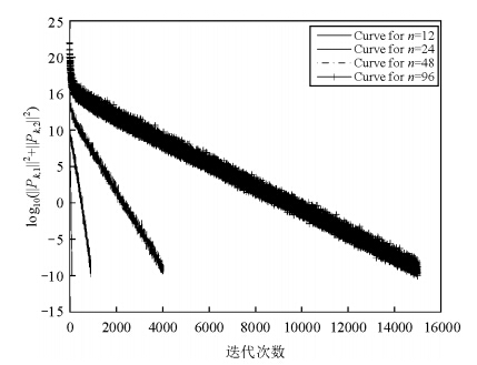 图 2描述了当$n=12,24,48,96$时停止条件$\sum\limits_{j=1}^2\|P_{k,j}\|^2$的收敛曲线. 从图 2中可以看到, 随着迭代次数的增加,$\sum\limits_{j=1}^2\|P_{k,j}\|^2$逐渐趋向于0.