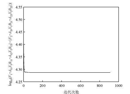 下面求解问题II. 不失一般性,令$n=24$. 设$\widehat{X}_1$是 ones$(24)$带有中心主子矩阵为toeplitz$(1:8)$的矩阵, $\widehat{X}_2$是eye$(24)$带有中心主子矩阵为hilb(8)的矩阵. 为了求与$[\widehat{X}_1,\widehat{X}_2]$相关的最佳逼近解 $[\widehat{X}_1^\ast, \widehat{X}_2^\ast]$,设$N_j=X_j-\widehat{X}_j\;(j=1,2)$, $\widehat{F_i}=C_i-A_{i1}\widehat{X}_1B_{i1}-A_{i2} \widehat{X}_2B_{i2}$, 初始矩阵为$[N_{0,1},N_{0,2}]=[{\rm zeros}(24),{\rm zeros}(24)]$, 应用算法3.1,迭代910步,可得方程组$A_{i1}N_1B_{i1} +A_{i2}N_2B_{i2}=\widehat{F_i}\;(i=1,2)$ 的最小范数解$[N_1^\ast,N_2^\ast]$. 因而与 $[\widehat{X}_1,\widehat{X}_2]$相关的最佳逼近解为 $\hat{X}_1^\ast=N_1^*+\widehat{X}_1,\hat{X}_2^\ast =N_2^*+\widehat{X}_2$.