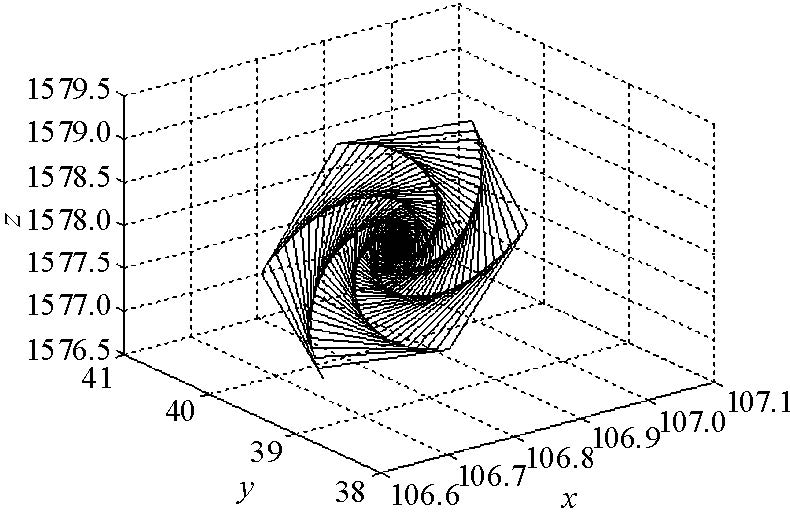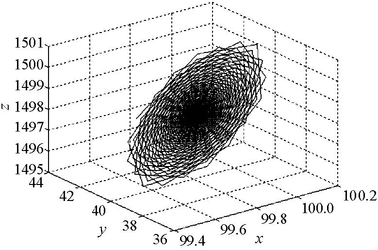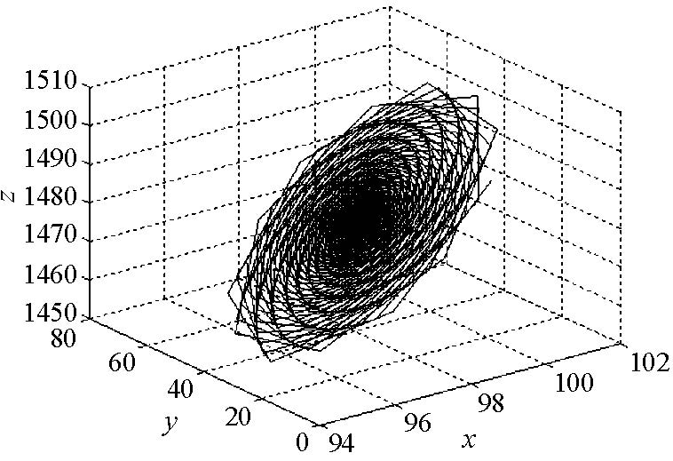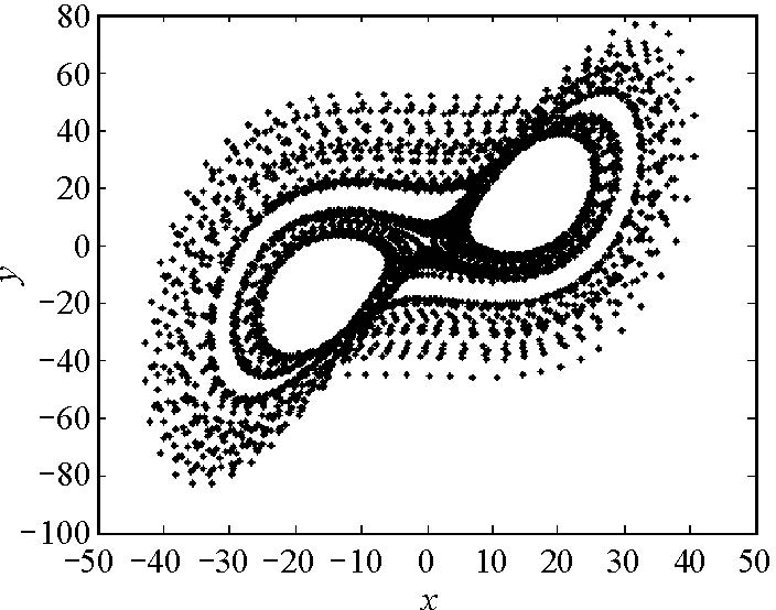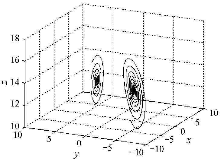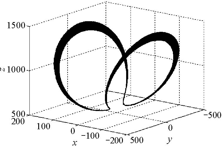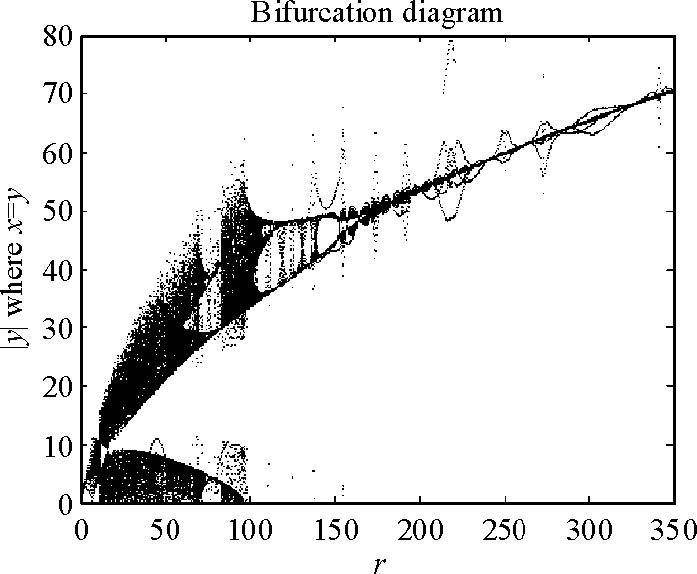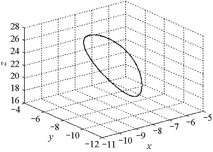 2) 当$r\geq 11.685...$时,非零平衡点$S_{+},S_{-}$开始不稳定,此时生成 两个不稳定的极限环(图 3-4为其中一个极限环及附近解轨线图), 随着$r$的增大产生双环解轨线,并且轨线条数随$r$的增大而逐渐增多(见图 5-8), 最终$(r=17.85...)$生成了奇怪吸引子(见图 9-10),这是一种阵发性混沌.