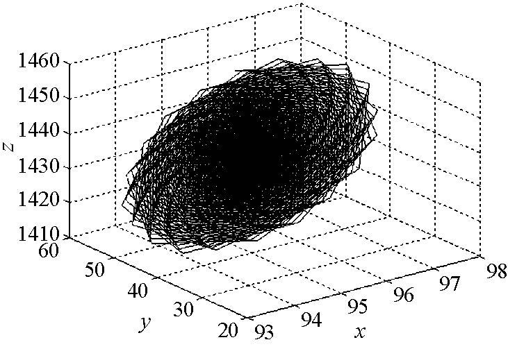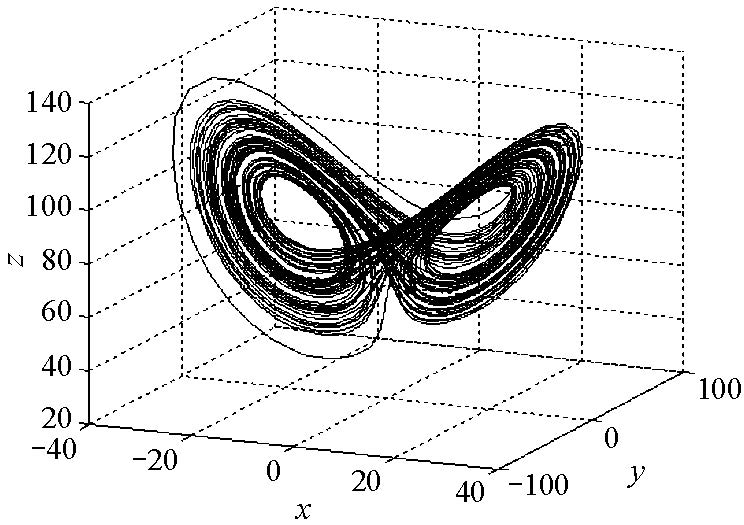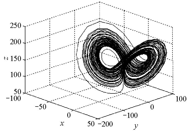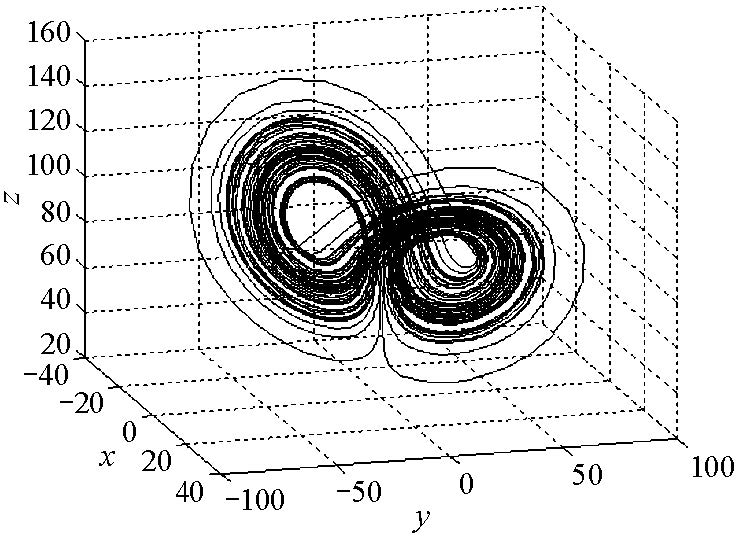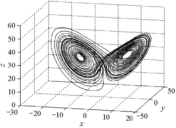证 对系统(2.1)作运算得 $$ \frac{ \partial \dot{x}}{ \partial x}+\frac{ \partial \dot{y}}{ \partial y} +\frac{ \partial \dot{z}}{ \partial z}=-(\sigma+b+1)+\frac{c}{r}z . $$ 当$-(\sigma+b+1)+\frac{c}{r}z<0$时,系统是耗散的,故存在吸引子,即$z<\frac{r}{c}(\sigma+b+1)$ 是吸引子存在的条件.