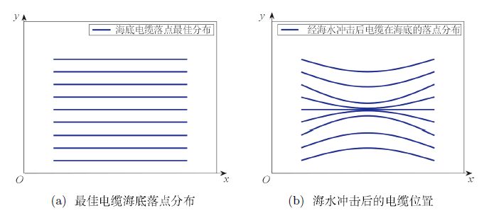 通常我们希望在人工地震区域上释放强度均匀的地震波, 因为变化剧烈的地震波会影响判断的效果.因此,我们希望各电缆落到海底的 位置最好呈均匀分布状态(如 图 1(a) 所示). 然而,由于海水的冲击作用, 电缆在海底的落点往往会分布不均匀(如 图 1(b)所示).因此,研究海底电缆铺设 过程中电缆线的运动轨迹,从而为探测船设计合理的施工路线和航行速度,以使得电缆 在海底的落点位置接近均匀分布状态,提高探测的准确性有着很重要的实际意义.