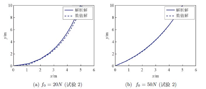 在文献[7]中,Faltinsen从物理分析的角度给出了静态情况下悬垂电缆线上各点的纵坐标$x$与 $y$, $T$的解析关系.在文献[7]中假设条件下,本节的定理3.1利用数学的方法严格推导出了 与文献[7]等价的$x$,$y$,$T$与弧长参数$s$的解析关系.并将定理3.1的结果延伸到更一般的情形 (定理 3.2),提出了相应的解的存在条件.同时,通过找出静态 解的解析式,我们可以利用(4.2)--(4.8)式计算相同条件下的数值解,通过数值解与解析式的比较, 一定程度上可以体现数值格式(4.2)--(4.8)式的高精度性.