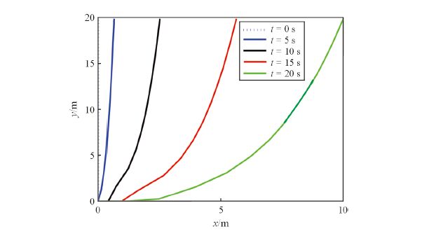 假设 $a(t)$ 表示$t$时刻悬垂电缆与海底接触点(TDP)的$x$ 坐标值, $b(t)$表示$t$时刻的电缆总长度,则有 $ x(s,t)\big|_{t=0}=0,\ \ \ \ \ y(s,t)\big|_{t=0}=s, $ (2.15) $ \frac{\partial x(s,t)}{\partial t}\Big|_{t=0}=0,\ \ \ \ \ \frac{\partial y(s,t)}{\partial t}\Big|_{t=0}=0, $ (2.16) $ T(s,t)\big|_{t=0}=(\rho-\rho_{0})gs,\ \ \ \ \ a(t)\big|_{t=0}=0, $ (2.17) $ b(t)=\left\{\begin{array}{ll} h+0.5a_0t^{2} , & 0\leq t<\frac {\sigma}{a_0},\\ h+ \frac {{\sigma}^2}{2a_0}+\sigma (t-\frac {\sigma}{a_0}),~~ & t \geq \frac {\sigma}{a_0}, \end{array}\right. $ (2.18) 其中,$\sigma$ 表示探测船最终的匀速速度,$a_0$ 表示探测船加速过程中的加速度, $h$ 表示海底的深度.
