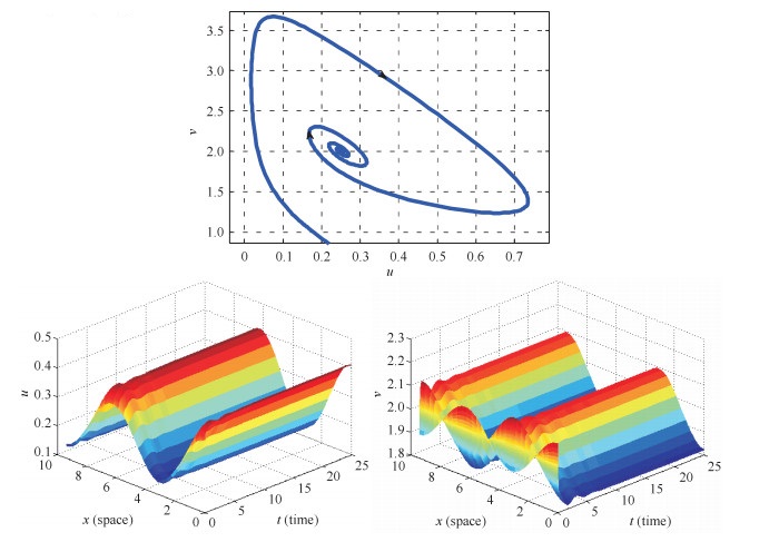 其次, 我们考虑霍普夫分歧.令$a=4$, $b=5$, $p=2$, 则$(u_*, v_*)=(0.25, 2)$, $\lambda_0=20/9$且$\chi=5$.我们选取$d_1=1$和$d_2=2$使得$d_2/d_1<\chi$, 计算可得$\mu_c\approx0.491$, $ 0=\mu_0<\mu_1\approx0.1111<\mu_2\approx0.4444<\mu_c<\mu_3=1. $从而可得可能的霍普夫分歧值为: $ \lambda_0^H=\lambda_0\approx2.2222>\lambda_1^H\approx2.111>\lambda_2^H\approx1.7778. $当$\lambda$逐渐较少到$\lambda_0^H$, 霍普夫分歧发生从而产生了空间齐次轨道 (见图 2).
